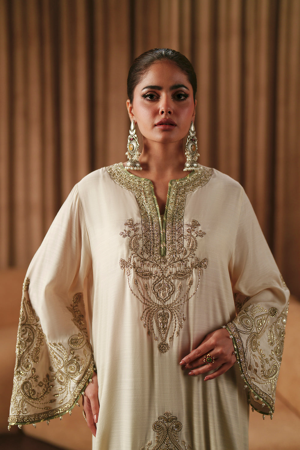 Experience a beautiful blend of vintage charm and artistic detail with this embroidered suit. The off-white shirt is adorned with intricate paisley embroidery, highlighted with subtle shimmering sequins for an elegant touch. Designed in a long A-line silhouette, the shirt features a richly embroidered hem set on a copper-toned patch, detailed with pink, gold, and green accents. Paired with coordinating wide-leg trousers finished with a heavily embroidered hem, the ensemble comes together seamlessly. A refined mix of timeless craftsmanship and modern sophistication, this statement piece is perfect for making a distinctive and elegant impression.