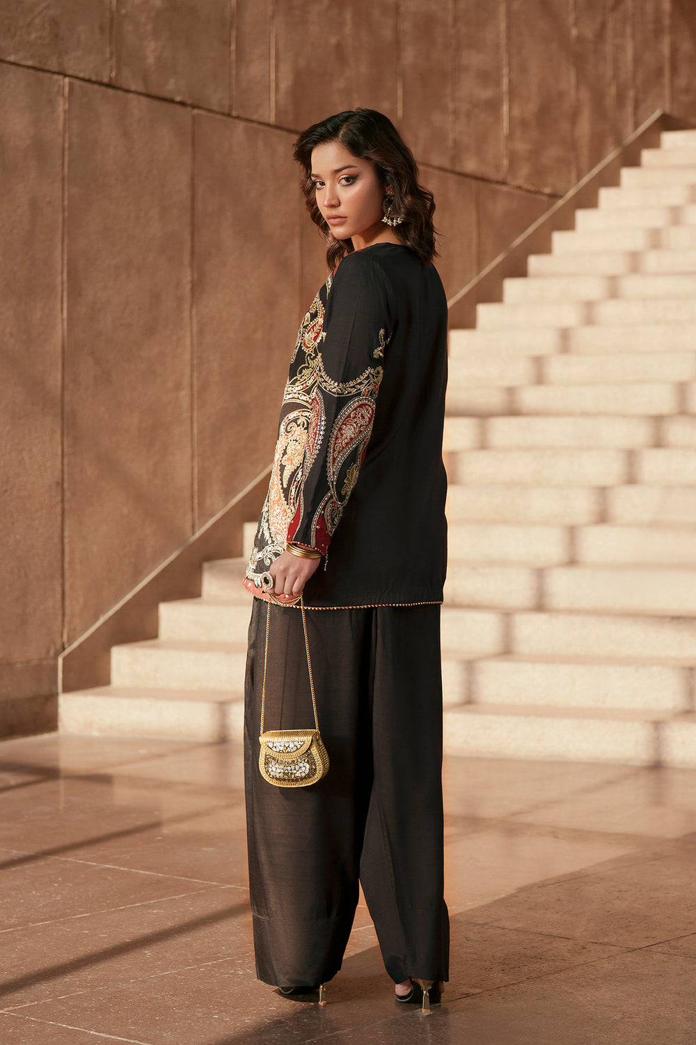 This striking black and crimson ensemble is a masterclass in modern ethnic elegance, blending traditional artistry with a contemporary silhouette. Designed for the woman who loves to make a bold statement, the outfit features a short-length shirt meticulously adorned with intricate embroidery in shades of rich crimson and antique gold. The ornate paisley motifs and scrolled patterns create a regal, tapestry-like effect across the bodice, while the refined split neckline and full-length sleeves add a touch of sophisticated structure. The look is perfectly balanced by voluminous, pleated shalwar in a sleek charcoal finish. The pleated detailing provides an effortless drape and movement, making it as comfortable as it is stylish. This ensemble is an ideal choice for high-end evening soirées or festive gatherings where you want heritage-inspired craftsmanship to meet high-fashion flair. Pair it with gold statement earrings and a traditional metallic clutch to let the detailed threadwork truly shine.