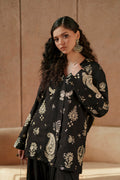 Make a stunning impression with this jet-black two-piece suit, featuring a luxurious display of gold-toned embroidery. The shirt is artfully adorned with a variety of traditional motifs, including large paisley patterns, delicate floral sprigs, and whimsical bird illustrations scattered across the front and long sleeves. A clean V-neckline and a simple button-down placket provide a structured finish to the relaxed, straight-cut silhouette. This elegant ensemble is perfectly coordinated with voluminous black trousers that offer a graceful, airy drape, creating a sophisticated and timeless look.