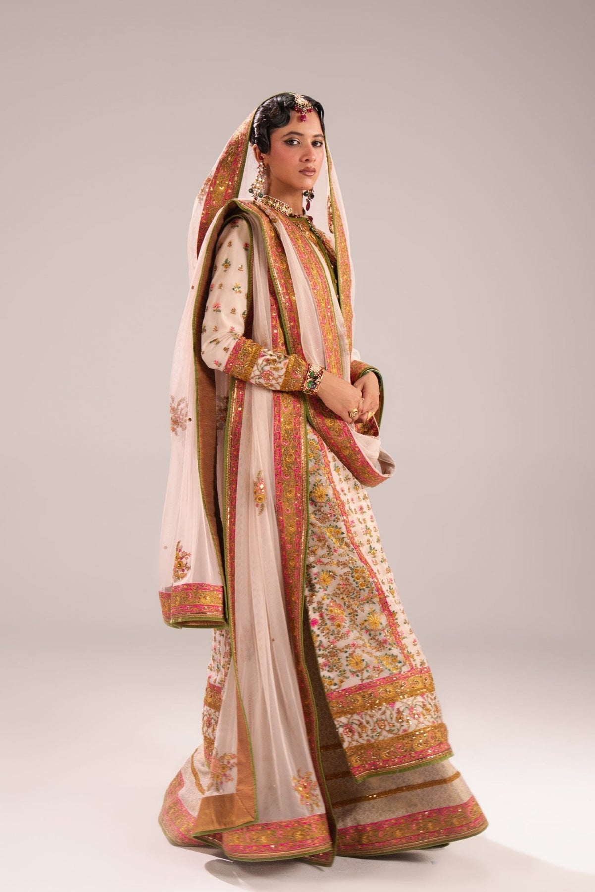 Elegant ivory Ensemble three-piece traditional outfit, a long Kurta with a sharara rendered in an elegant color palette of ivory/off- white, accented by gold and pastel tones. The long straight. Kurta is the centerpiece, featuring a heavily embroidered neckline. The body of the kurta is covered in small, repeated vertical motifs, mainly in pastel pink and gold. The sharara is in jamawar with wide, ornate borders in pink, olive green, and gold. A sheer net dupatta in ivory completes the look, featuring heavy embroidery and a thick border that echoes the pink and green accents of the main garment. This ensemble achieves a look of classic grandeur with a charming modernity.