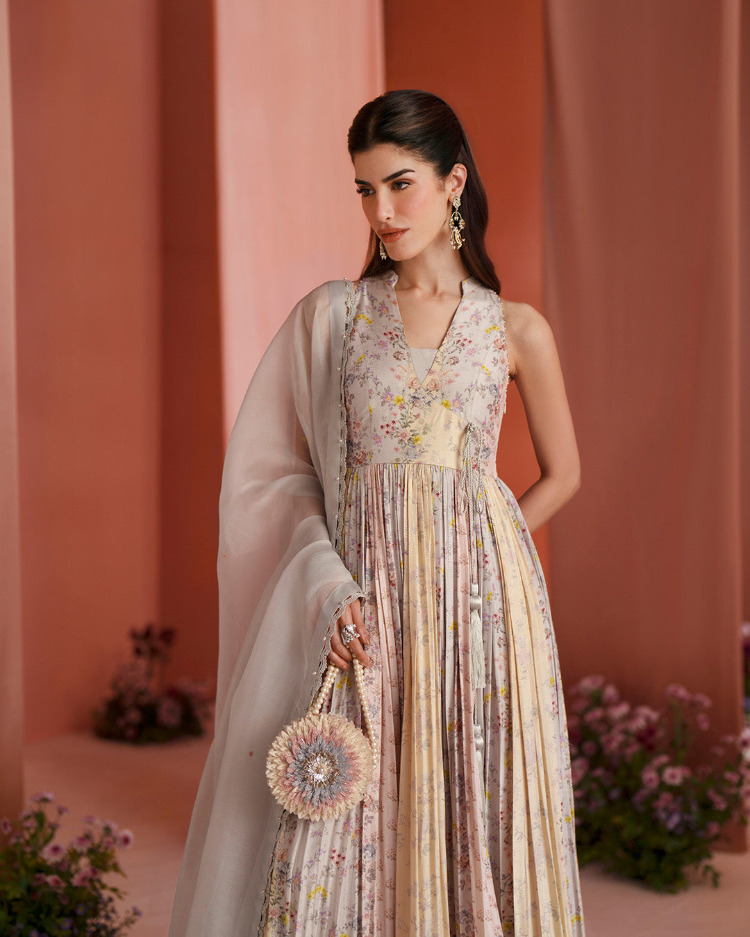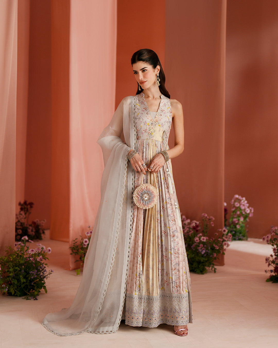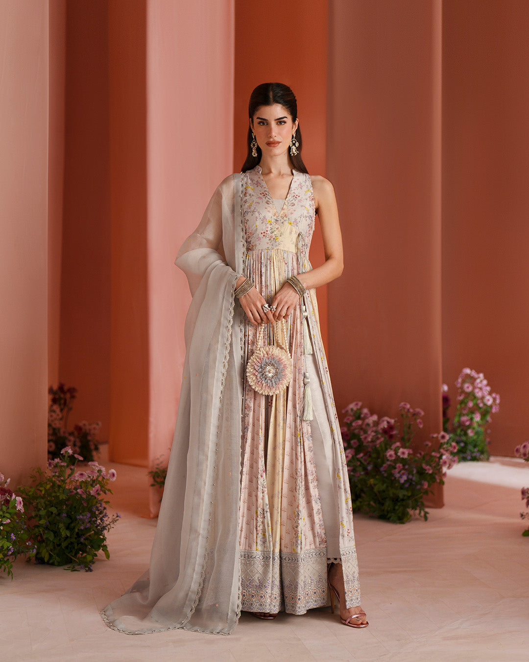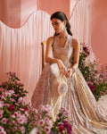 Echoing refined sophistication, Tehani harmonises soft tones with elaborate adornment. Set on pastel printed raw silk, the pishwas carries an artfully composed blend of resham and sequin work that lends a delicate glow. Paired with Raw Silk trousers and an intricately embroidered organza dupatta, this outfit brings together a classic silhouette that elevates your presence at every occasion.