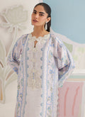 Finished with composed embroidered borders along the sleeves and hem, the silhouette feels structured yet fluid. The ensemble is paired with a raw silk izaar, embellished and finished with a schiffli border, and completed with a silk dupatta, edged with embroidered borders all around. Bellora is ideal for refined festive moments where detail, movement, and elegance come together effortlessly.