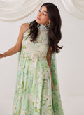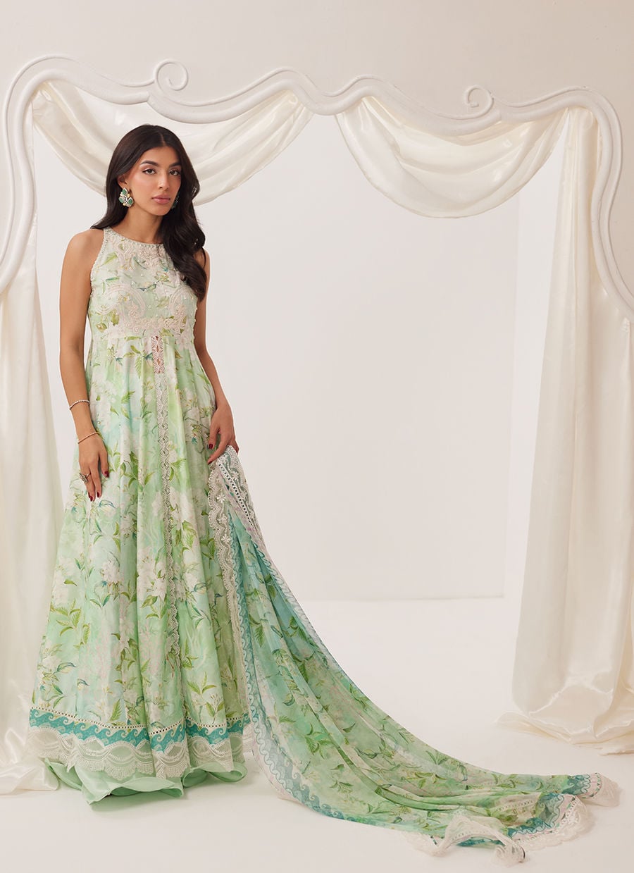 Paired with a matching printed dupatta edged with subtle detailing, this ensemble feels ethereal and serene—perfect for sunlit celebrations, garden gatherings, or elegant daytime occasions.
