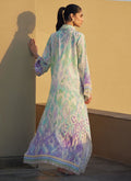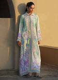 Soft, dreamy, and artfully detailed, this crepe silk kaftan features a delicate ikat digital print in pastel tones of lavender, aqua and periwinkle. The collar is adorned with lustrous pearls, adding a refined touch, while the sleeves are embellished with hand-crafted tassels and cowrie shells for a charming, artisanal finish. Effortlessly fluid and beautifully curated, this kaftan brings together elegance and whimsy in perfect harmony.