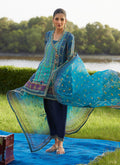 Turn up the glamour with this striking ink blue and teal ensemble — a seamless blend of tradition and contemporary allure. Cut from pure raw silk, the silhouette is designed to flatter effortlessly, featuring a thigh-skimming wrap top that cinches loosely at the waist for a beautifully feminine shape. Intricately hand-embellished with sequins, gota, and aari work, this piece radiates festive opulence. The tapered pure raw silk shalwar balances the drama with refined sophistication, making it an eternal favorite for every celebration.