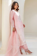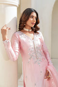 This exquisite ensemble combines two shades of pink, evoking the essence of spring. The two-tone raw silk shirt, adorned with intricate embroidery and a hand-embellished neckline featuring pearls, sequins, and delicate handwork, exudes sophistication. Paired with loose pants and a pure organza embroidered dupatta adorned with tassels, the outfit radiates elegance, perfect for any spring occasion