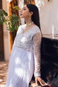 Ice blue pishwaas on a flowy net, with intricate details on the bodice with a screen printed silk border and embroidered detailing on the sleeves.