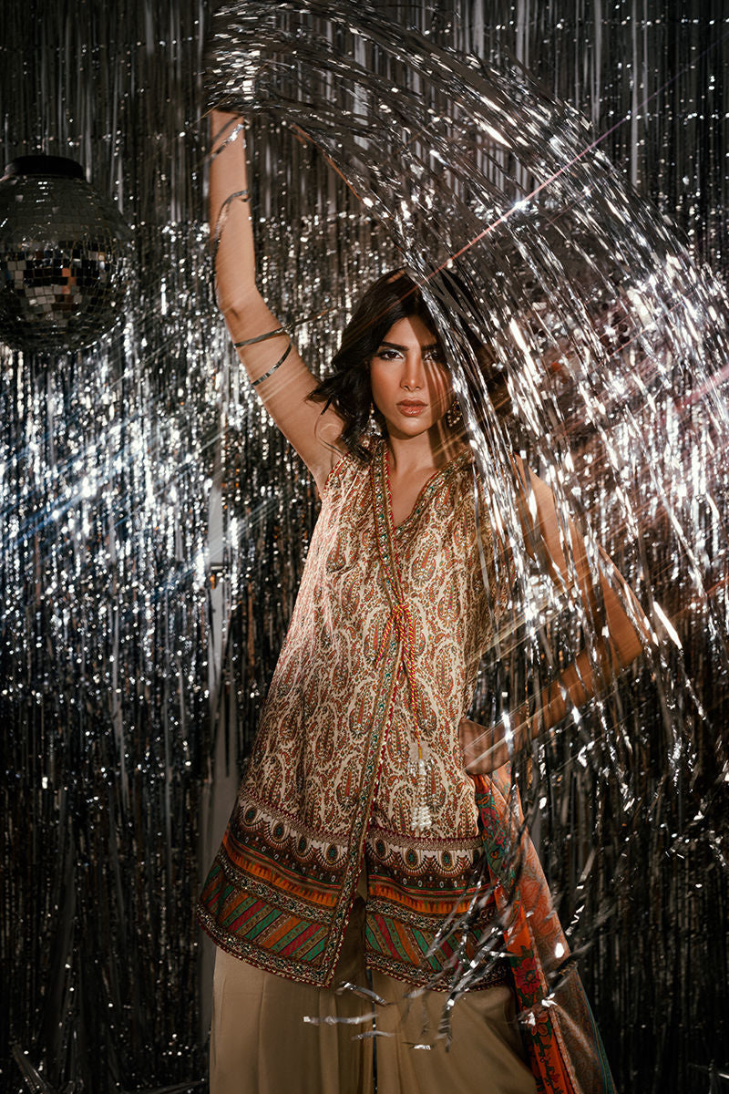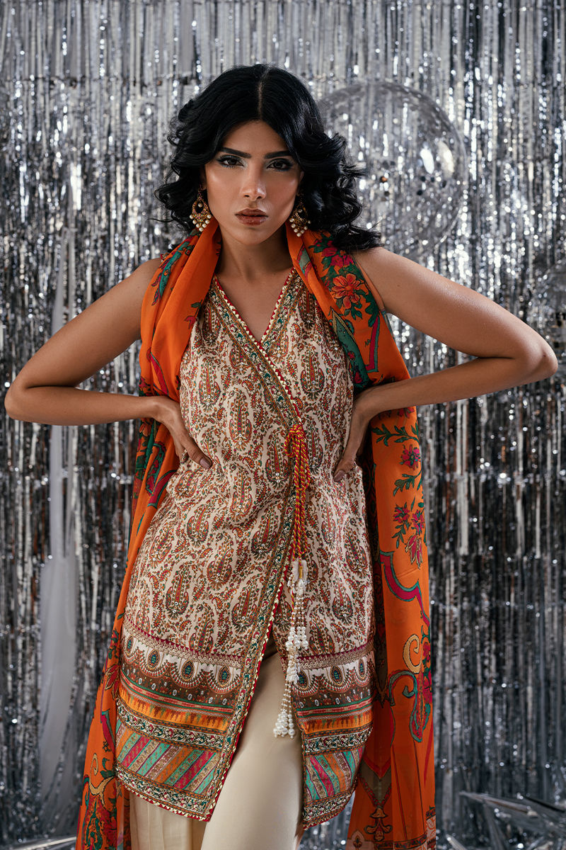 Exuding timeless charm, Beige Nadine is a beautifully crafted digital print angarkha featuring delicate patterns and refined detailing. The look is completed with plain flared pants and a coordinated digital print dupatta, creating a graceful balance of sophistication and modern elegance—perfect for festive gatherings and elegant daywear.