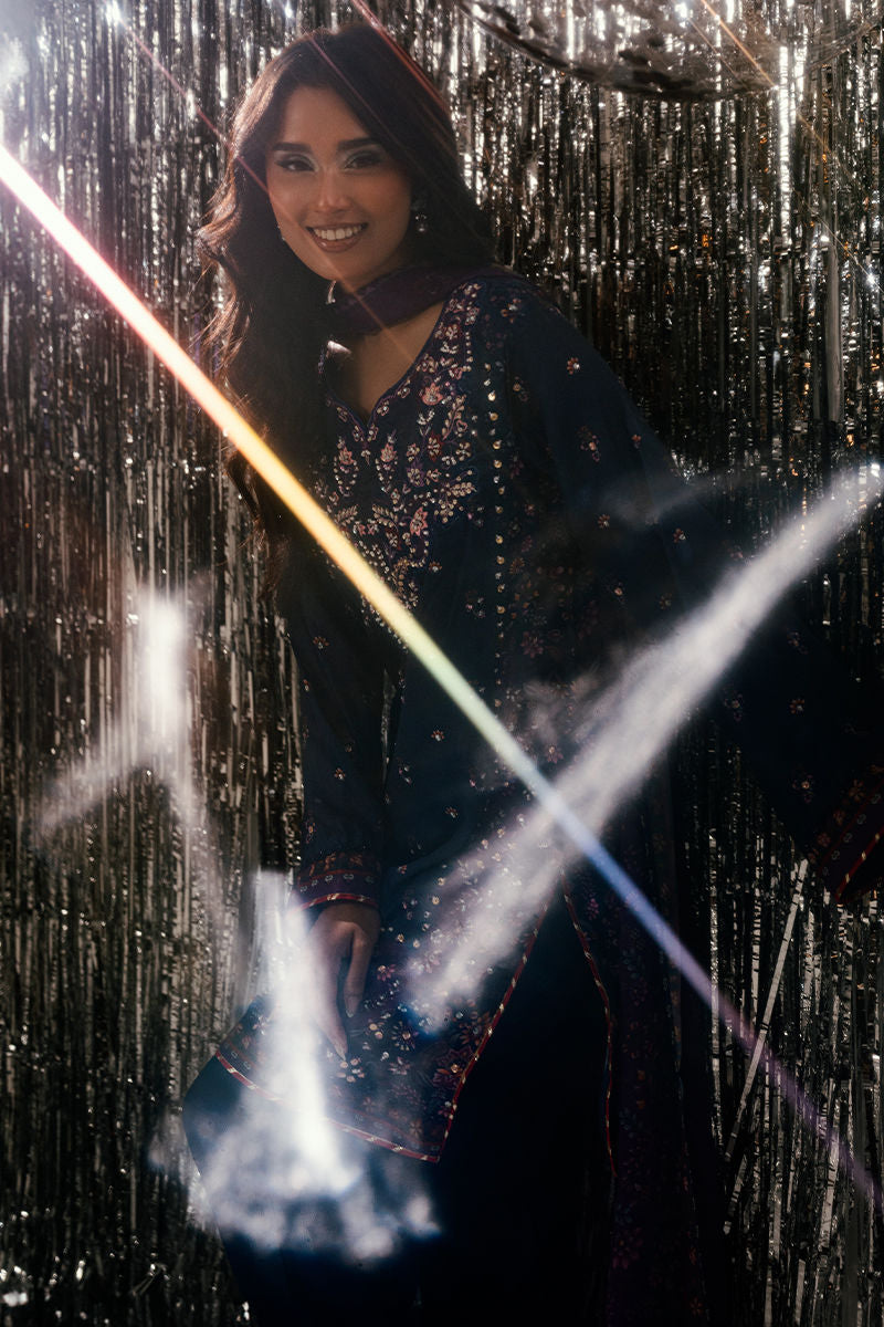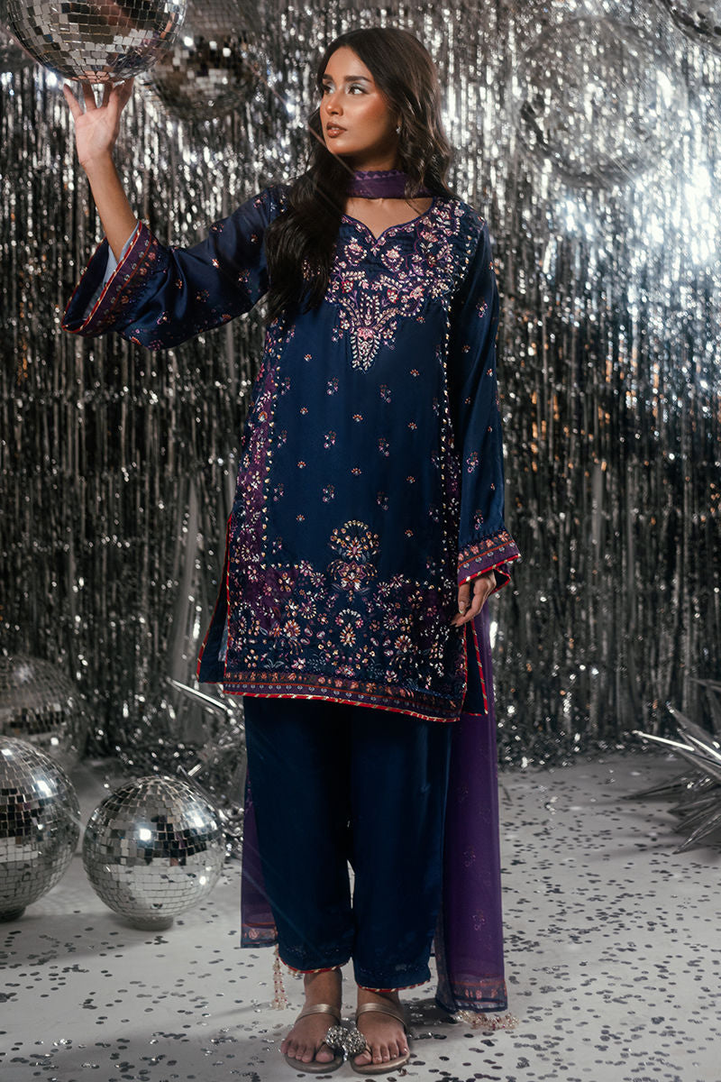A captivating play of deep blue and regal purple tones, Midnight Amethyst exudes timeless sophistication. The short shirt is adorned with intricate handwork and delicate embroidery, adding subtle glamour to its rich color palette. Paired with a coordinated trouser and a beautifully composed digital print dupatta, this ensemble strikes the perfect balance between modern refinement and classic allure—ideal for festive evenings and elegant gatherings.