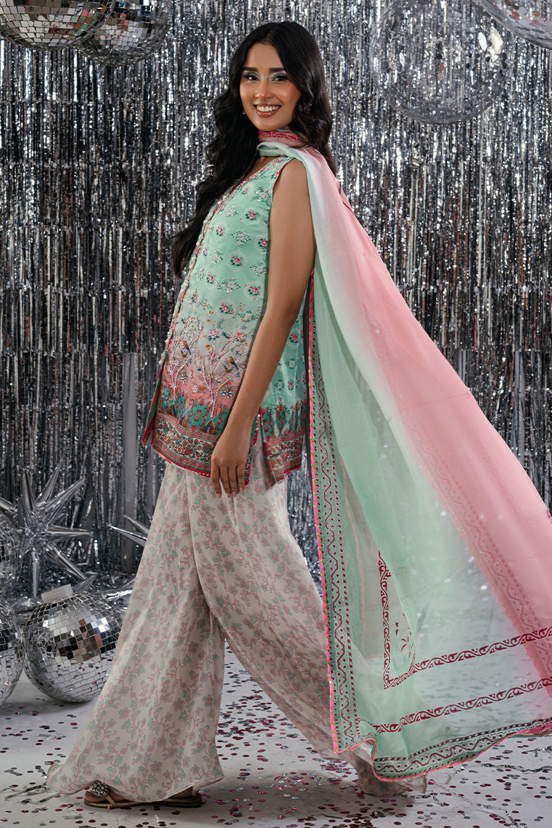 Soft, serene, and effortlessly graceful—Misty Mint features a delicate blend of mint and pink hues, adorned with intricate handwork and fine embellishments. The ensemble is paired with beautifully printed flared pants and a matching dupatta, creating a perfect harmony of elegance and contemporary charm. Ideal for festive occasions and refined daywear.