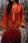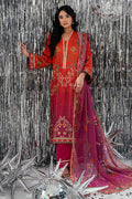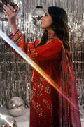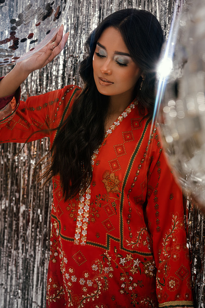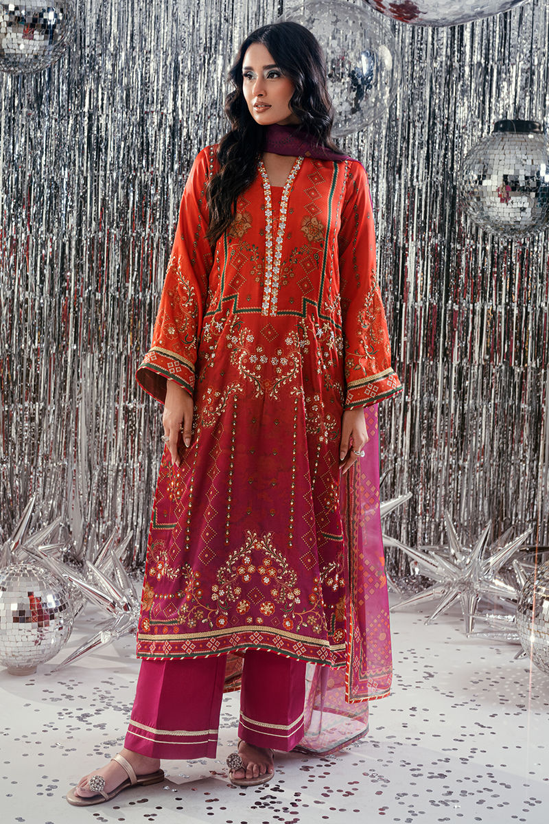A radiant expression of color and craftsmanship, Sunlit Umber brings together shades of burnt orange and magenta in a mesmerizing digital print that reflects warmth and vibrance. The long shirt features a contemporary composition with refined detailing, exuding effortless sophistication and modern grace. Paired with coordinated trousers and a matching digitally printed dupatta, the ensemble creates a harmonious balance of tone and texture—capturing the glow of twilight hues in motion. Elegant, timeless, and undeniably captivating, Sunlit Umber celebrates confident femininity through color, flow, and finesse.