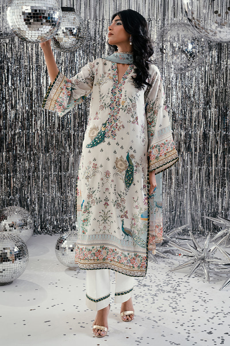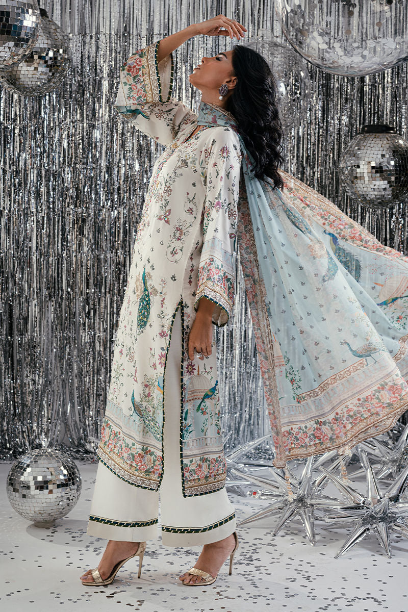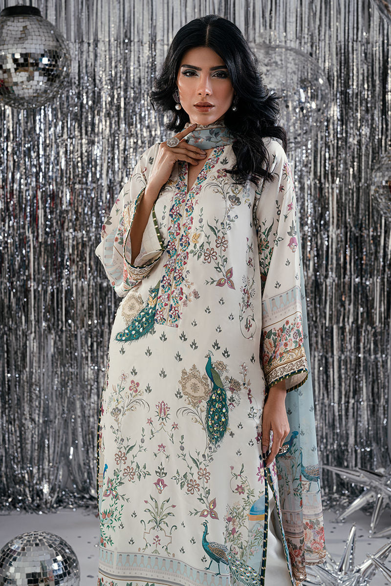 An ode to opulent artistry, Teal Peacock features a stunning digital-printed shirt adorned with majestic peacock motifs and intricate patterns that exude timeless allure. The design is enhanced with exquisite handwork, delicate embroidery, and fine embellishments that add depth and sophistication. Paired with a matching trouser and a beautifully coordinated digital print dupatta, this ensemble blends regal elegance with contemporary finesse—perfect for festive occasions and graceful soirées.