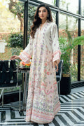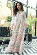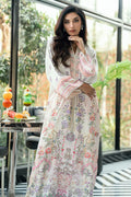 This elegant kaftan is crafted in a soft ivory-cream base, adorned with a refined digital floral print in delicate hues of lavender, blush pink, soft peach, and muted green. The silhouette is fluid and graceful, designed to drape effortlessly while maintaining a polished, elongated look.