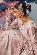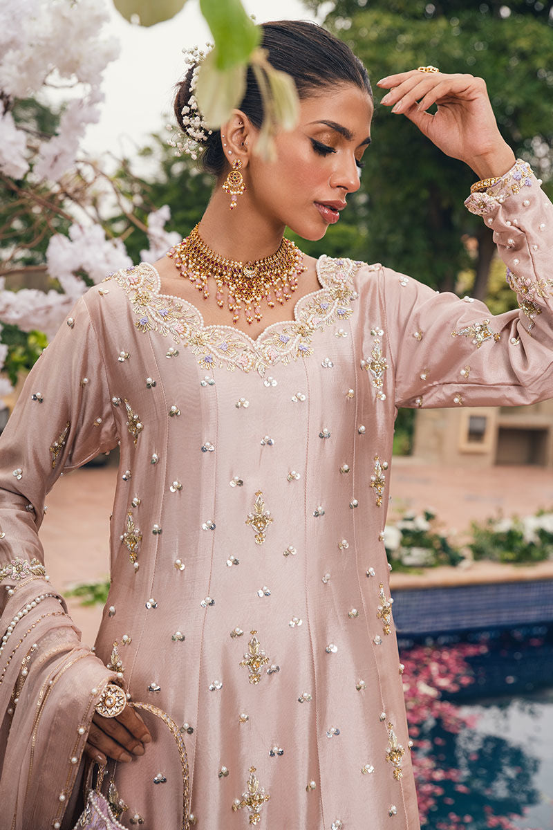 Long shirt in decadent coffee pink on silk canvas featuring opulent silk thread embroidered details in subtle ivory’s, pinks and lilacs which are further enhanced with all silver golden handwork. The shirt can be paired with matching jamawar flared pants.