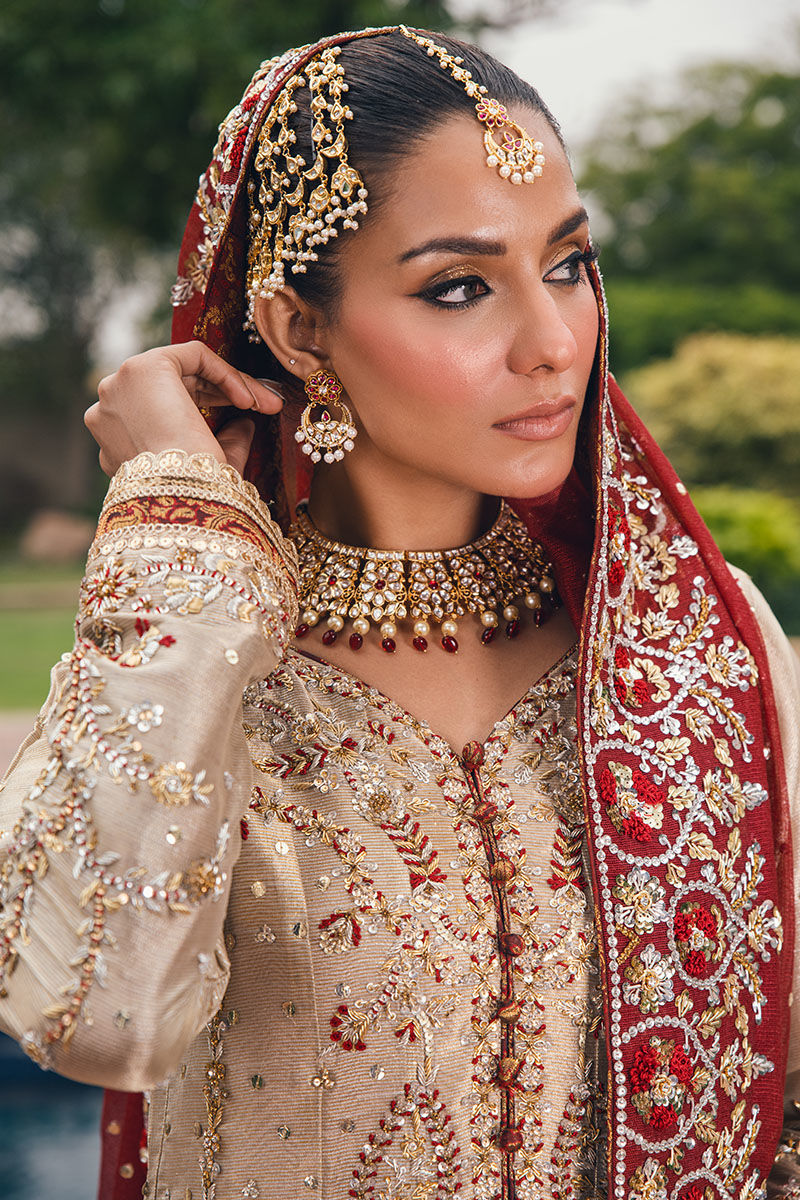 The exquisite golden lama tissue shirt boasts intricate antique naqshi, kora dabka, zardozi, and resham work. It is elegantly paired with a farshi frill sharara in a beautiful maroon shade. The ensemble is completed with a traditional dupatta made from pure silk net, featuring appliquéd borders heavily embellished with handwork, and adorned with sprayed sequins and bootis all over. This ensemble is a stunning display of craftsmanship and traditional beauty.