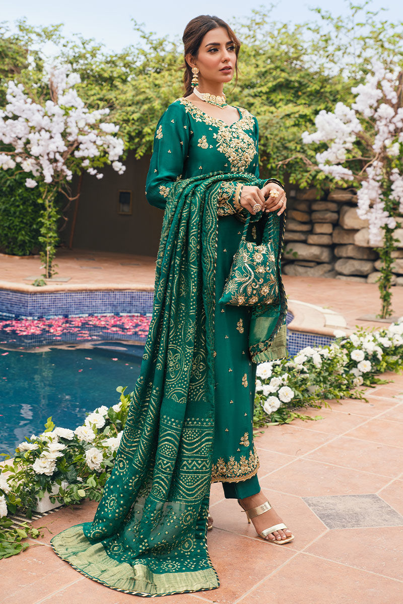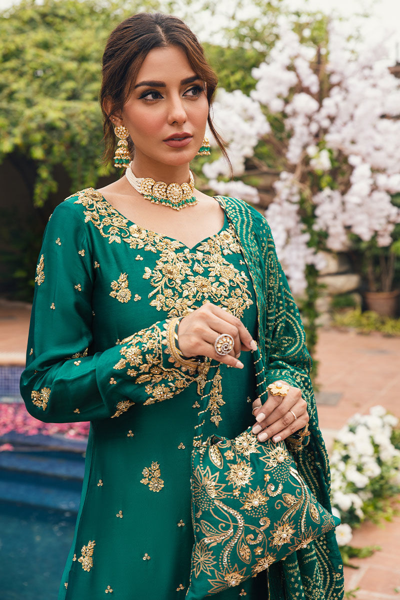 A truly exquisite and detailed outfit, perfect for the festive season! The combination of emerald raw silk, intricate floral motifs, zari embroidery, and handcrafted details sounds stunning. The use of kora dabka on the entire shirt along with the artful zari embroidery on the sleeves, must create a captivating look. The silk pants and dupatta complements the shirt beautifully.