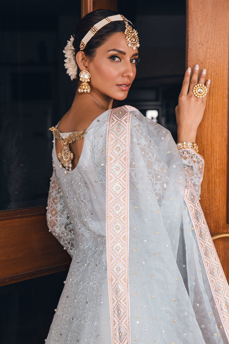 This stunning long silhouette kalidaar is an amalgamation of different patterns of floral embroidered organza. The neckline is handwork to detail with silk thread rosettes enhanced with pearls, sequins and light-catching crystals. The back neckline is further adorned with 3d roses and tassels. Long and bell sleeves with handwork and floral details add a twist. The shirt is paired with jamawar lehnga skirt with 3 colored tones embellished dupatta with block-printed trimmings