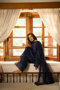 statement with this navy raw silk ensemble, designed for effortless sophistication. The shirt features contrasting embroidery on the sleeves, adding a chic, contemporary edge, while the trouser bottom mirrors the intricate detailing for a coordinated, fashion-forward lookStyle it with the optional chiffon dupatta for a touch of grace, or go minimal for a sleek, modern vibe. Perfect for festive gatherings, semi-formal events, or everyday ethnic elegance.