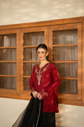 elegant basic wear raw silk ensemble, designed for comfort with a touch of classic charm. The outfit features a red–maroon raw silk shirt adorned with minimal yet refined embroidery, giving it a graceful, polished look perfect for routine wear or semi-formal settingsPaired with a black raw silk sharara trouser, the contrast adds depth and sophistication while keeping the style effortlessly chic. For an elevated finish, choose the optional organza dupatta, crafted in a soft gradient tint, adding lightness and flow to the outfit.