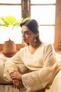 turn heads with this ivory raw silk ensemble, crafted for the modern yet tradition-loving woman. The shalwar sleeves feature intricate embroidery, soft-hued pearls, and delicate adda work, creating a luxurious, fashion-forward finishPaired with an optional chiffon dupatta, this outfit blends classic elegance with contemporary styling—perfect for festive brunches, family gatherings, or casual ethnic chic looks. The soft, flowing silhouette ensures comfort while making a subtle statement of sophistication