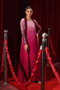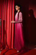 This double-gown ensemble radiates pure glamour. The sleeveless inner gown offers a soft, flared silhouette, while the outer layer with its dramatic long-collar neckline adds bold elegance. Fully embellished with Swarovski crystals, it shimmers from every angle. The heavily embroidered crystal sleeves heighten its opulent look. Finished in a stunning gradient from soft pink to deep maroon, it’s a luxurious, couture-worthy piece perfect for grand occasions.