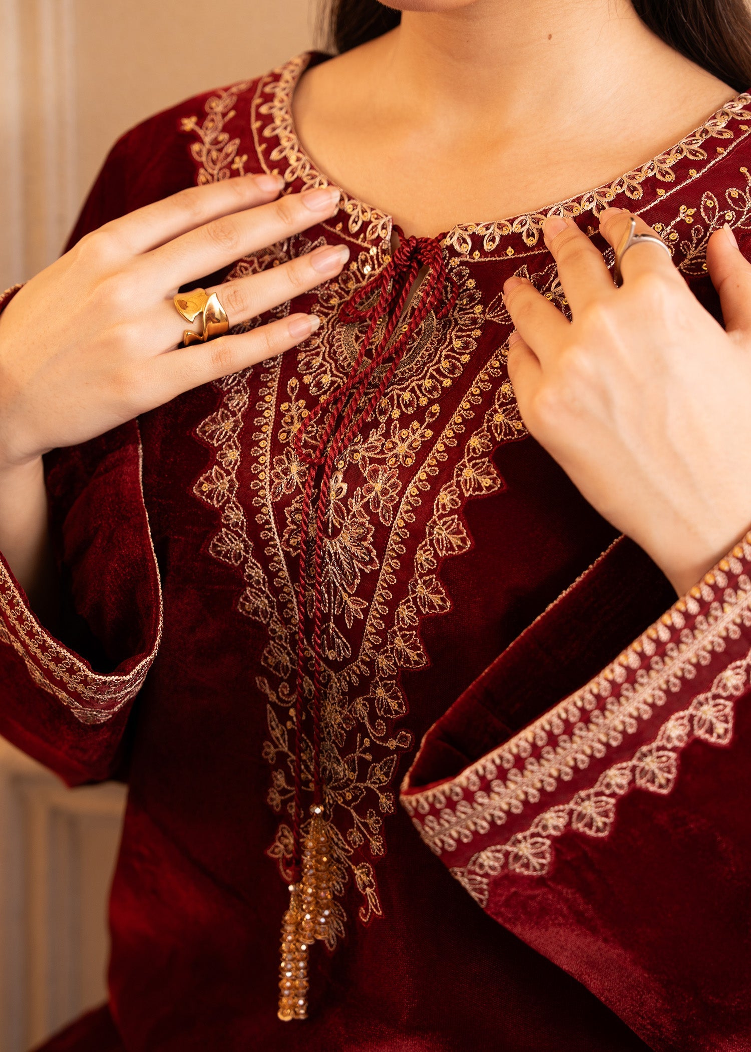 A graceful blend of tradition and modern tailoring, this 2-piece red velvet outfit offers timeless elegance with understated charm. Crafted from rich velvet in a deep red tone, it’s designed for refined occasions where every detail matters.
