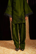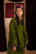 This olive velvet top features a classic crew neckline with a hook and eye closure at the back. The front and sleeves are adorned with exquisite dori work, displaying attention to detail. Full-length bell sleeves with organza finishing giving a comfort refined touch, while the matching olive velvet shalwar ensures a polished look.