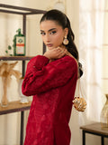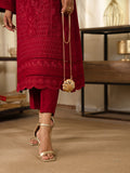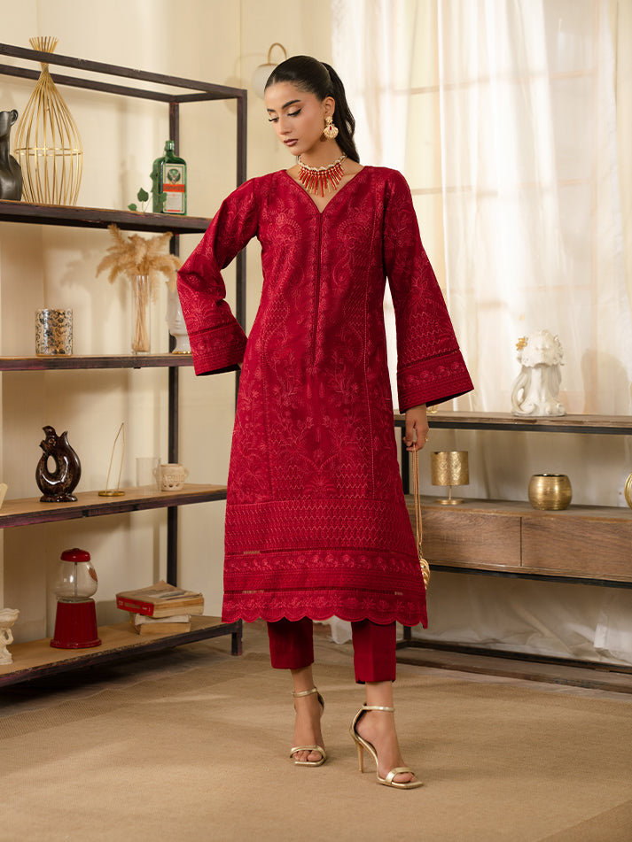 Monotone fully embroidered karandi shirt with intricate embroidery detailing in shades of deep red thread - the outfit is styled as a loose fit shirt with kurta sleeves & scalloped borders for the shirt along with karandi trousers.