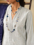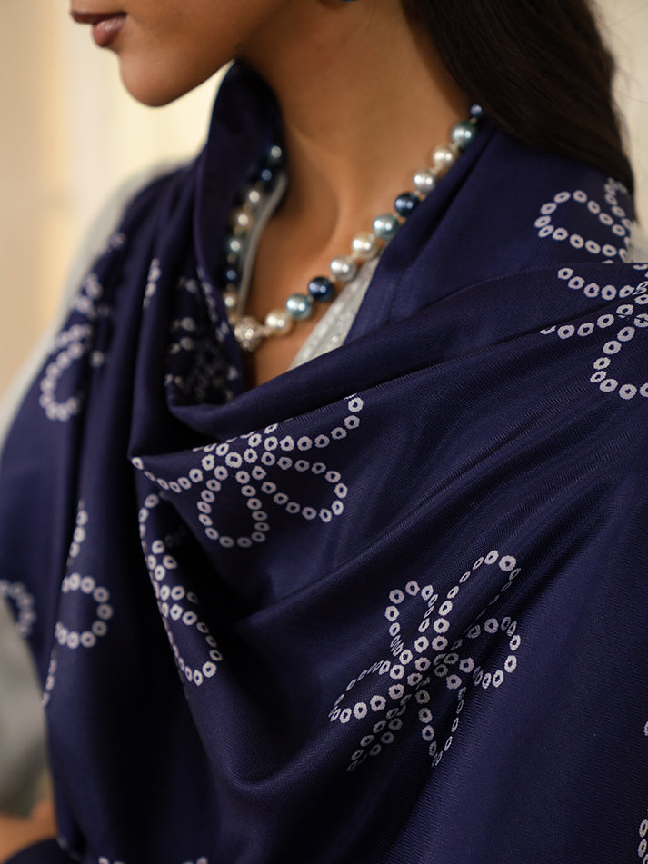 Vena is a light ash grey karandi shirt and trouser paired with a contrasting navy blue herringbone shawl for the winter season. The shirt is fully embroidered and features monotone embroidery in shades of light grey and off-white thread. Styled in a semi-formal way, the outfit is a perfect choice for the winter season.