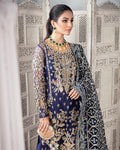 Qayinaat - is the most sought after design this wedding season. The midnight blue long A-line shirt is heavily handworked and is paired with a heavy embroidered jaal dupatta and a flaired sharara trouser finished pff with a beautiful embroidered border.