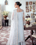 Saika - is a wondrous ice blue long A-line shirt that is fully embellished and adorned with pearls, Swarovskis, dabka, nakshi and crystals. This article is adorned with heavily composed dupata and bootcut raw silk pants.