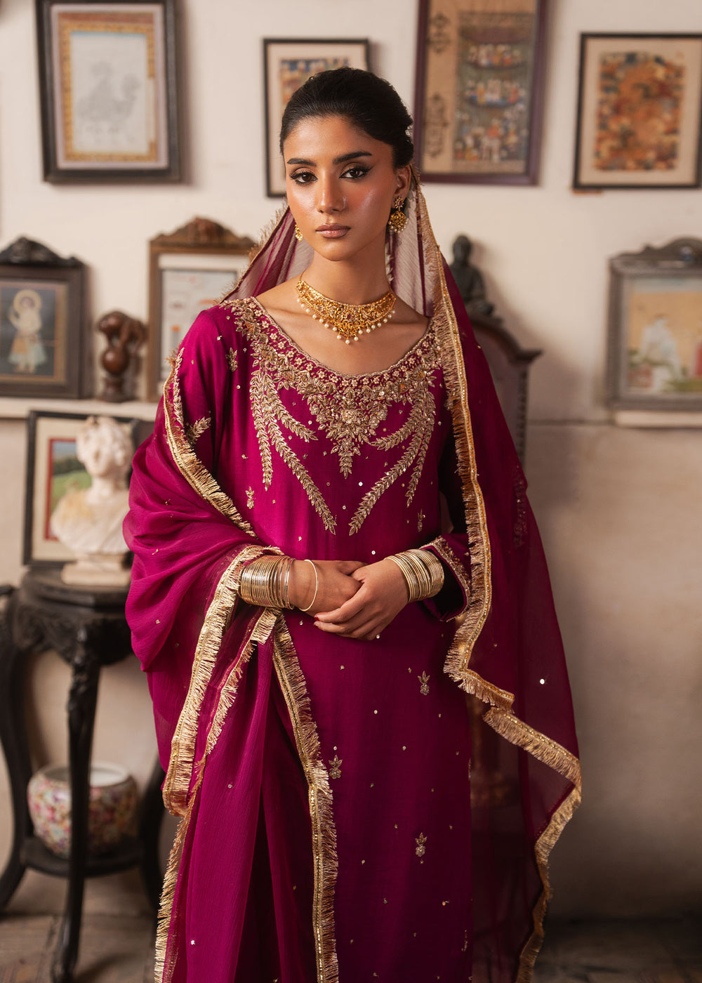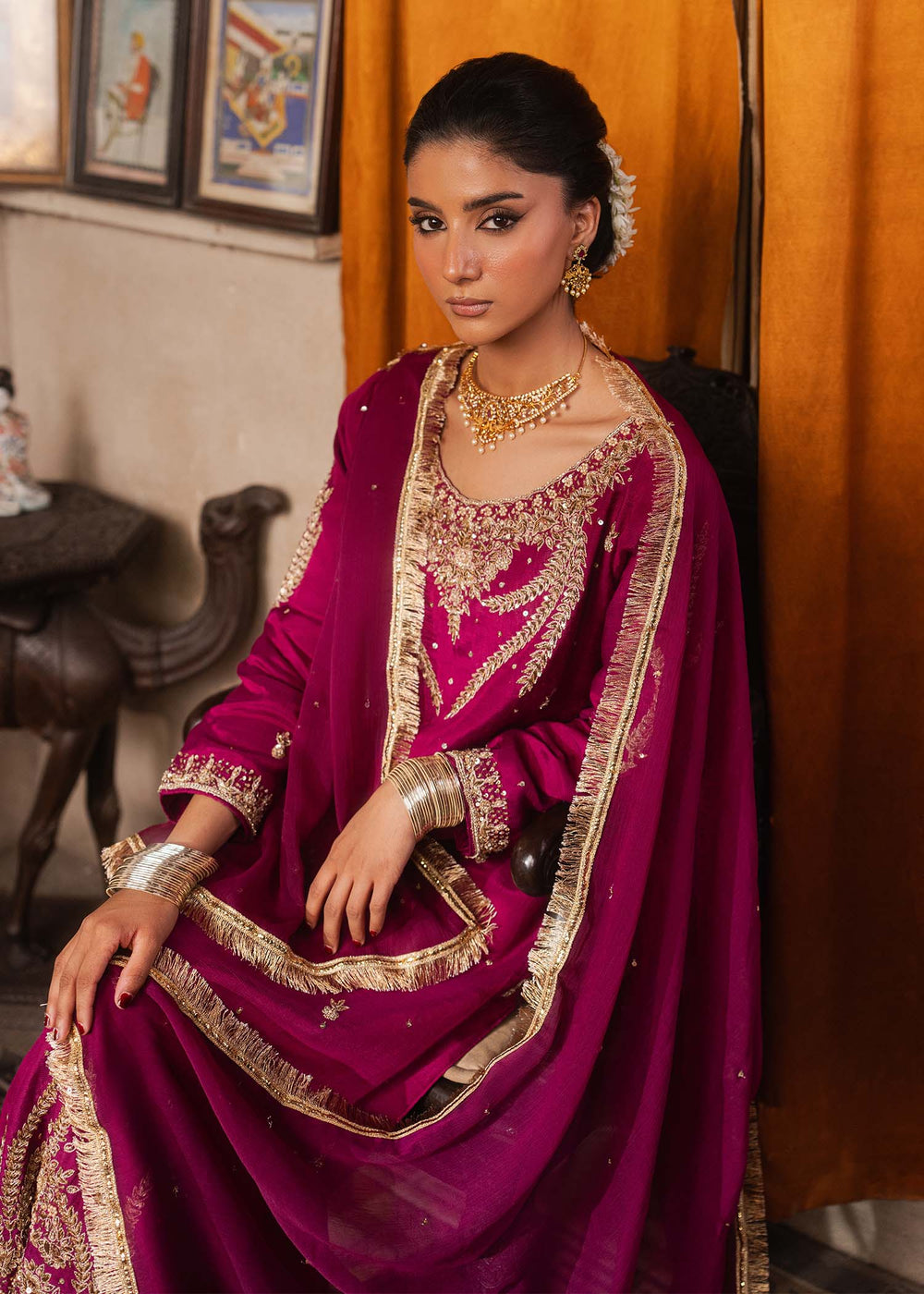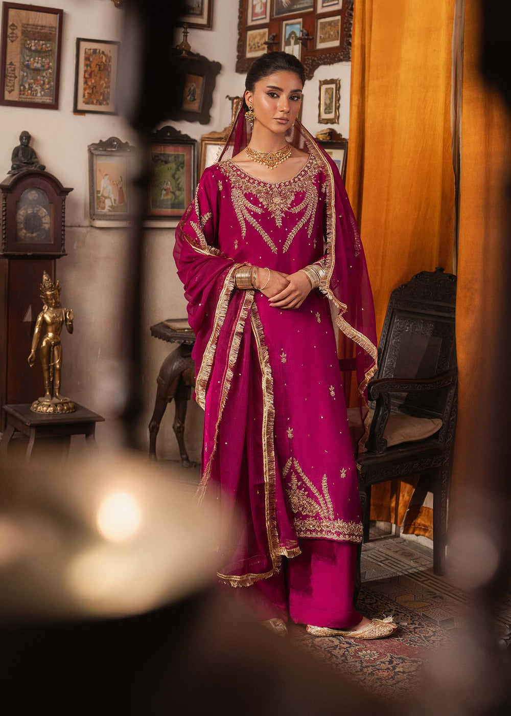 Foshina is a bold yet elegant statement, crafted in a vibrant fuchsia palette. Architectural gold embroidery adds structure and impact, while maintaining a refined balance. Designed for confident dressing, this ensemble commands attention at formal soirées and festive events.