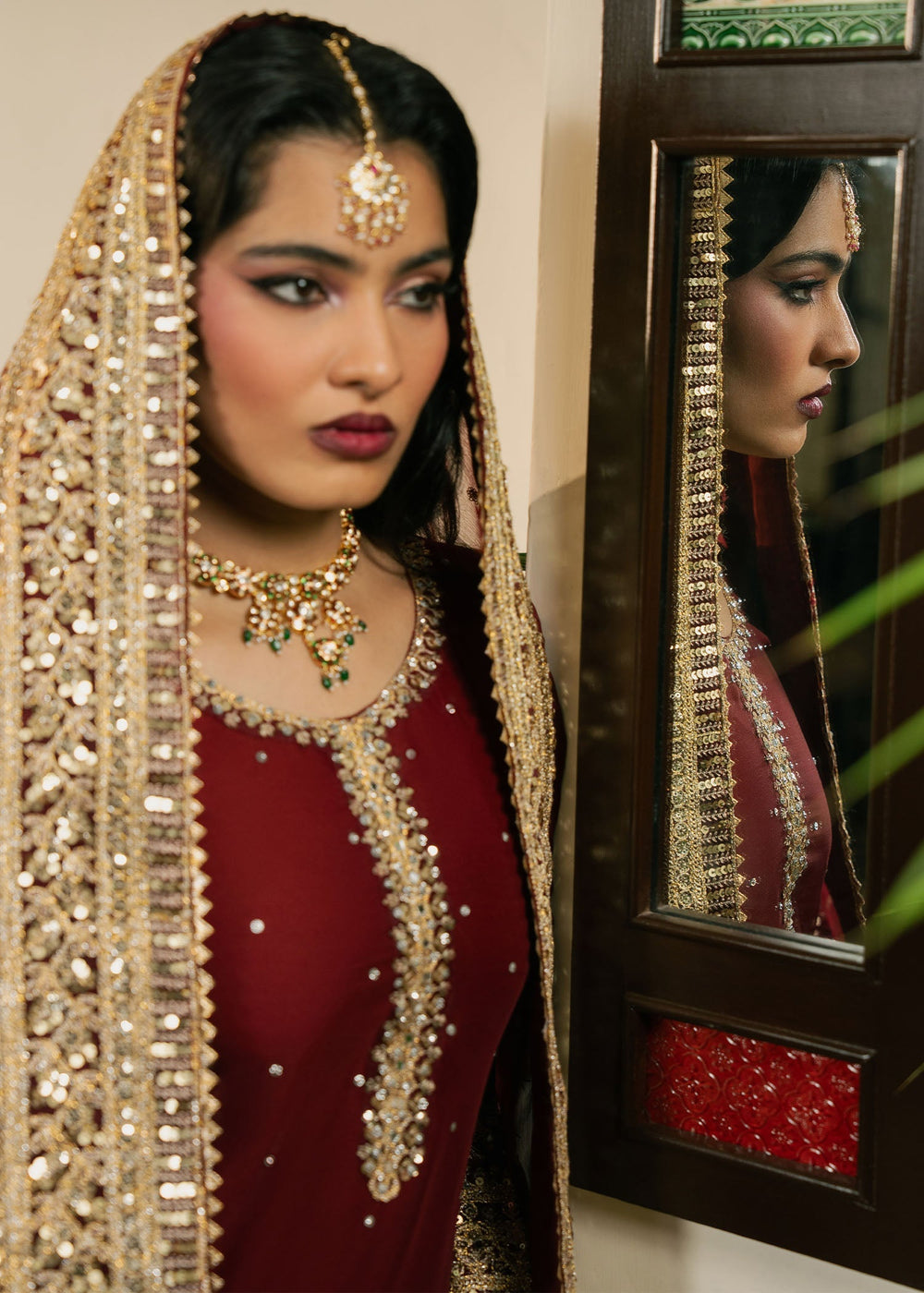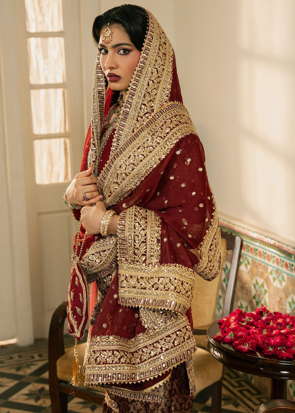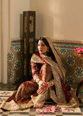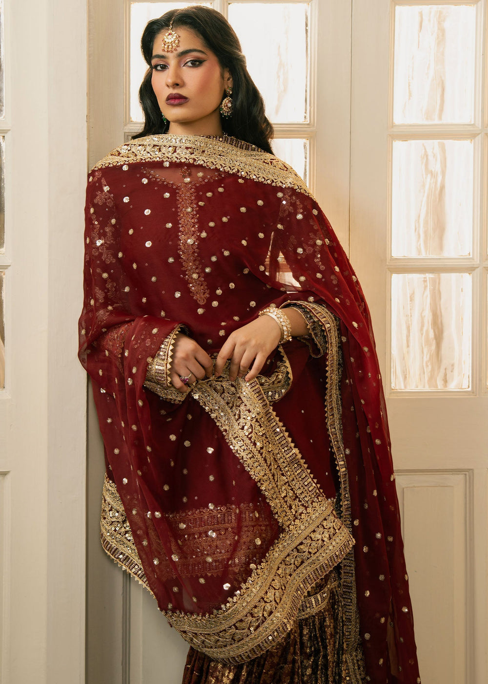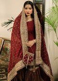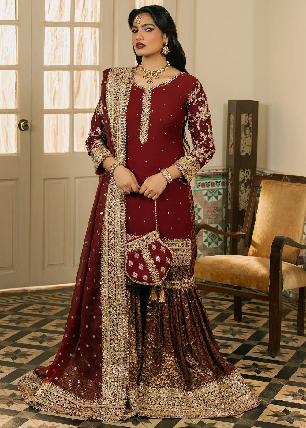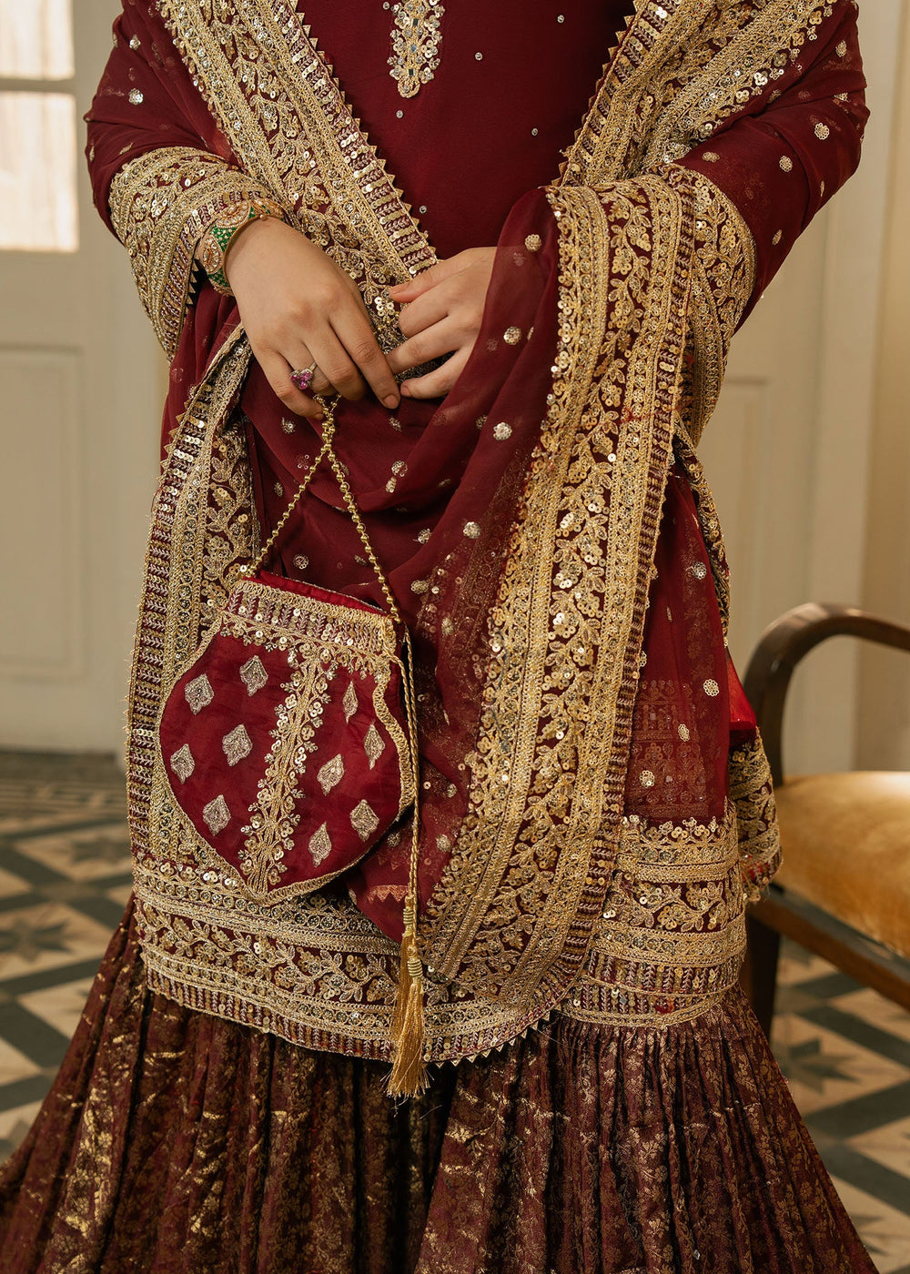 Gulnazar — A deep maroon masterpiece layered with intricate gold embroidery. The shirt’s handwork evokes heirloom craftsmanship, while the crushed velvet sharara introduces winter depth and richness. The heavily embellished dupatta and handcrafted potli complete the ensemble, creating a powerful, majestic look.