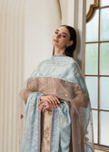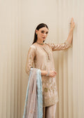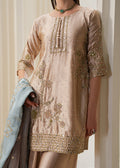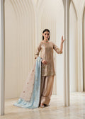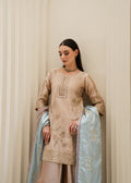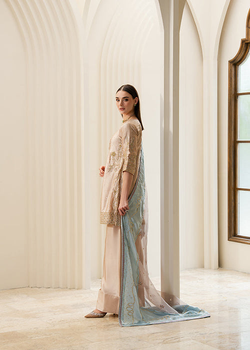 A sand-beige base paired with a cool pastel blue dupatta, adorned with delicate bead and thread highlights. The look is serene, airy, and understated, ideal for daytime elegance or soft winter gatherings.