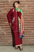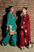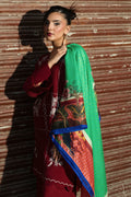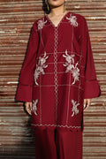 Elevate your wardrobe with this 3-piece red ensemble featuring an embroidered lawn cotton shirt, matching trousers with geometric motifs, and a printed silk dupatta. Stylish details like a V-neck, scalloped hemline, and lace-trimmed cuffs add timeless charm to this elegant outfit.