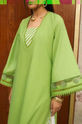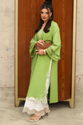 Brighten up your wardrobe with this parrot green and white lawn cotton set, featuring a mid-calf shirt with embroidered borders and criss-cross neckline detail. Flared sleeves with 3D motifs and scalloped-edge trousers add a playful yet elegant touch.