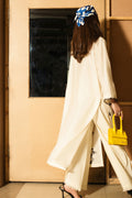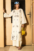Timeless and graceful, this off-white cambric set showcases a knee-length shirt with floral embroidery, loop button detailing, and flared sleeves with contrast edging. Paired with straight-fit trousers featuring frayed edges, it blends subtle charm with contemporary style.