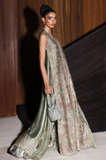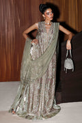 Drape yourself in elegance with this mint masterpiece, adorned with naqshi work, Swarovskis, gota, and sequin detailing. The tissue silk long shirt paired with a shimmer Sharara and a choice of net dupattas offers an exquisite combination of tradition and allure.