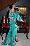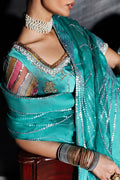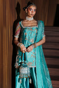 A harmonious blend of luxury and tradition, this stunning Ferozi ensemble showcases a square neck short shirt adorned with intricately hand-embellished florals and delicate chatta patti sleeves. Paired with a pleated tissue silk shalwar featuring lappa details, the outfit radiates elegance, further enhanced by the pure organza dupatta, shimmering with exquisite sequin work. Each element, from the Swarovski crystals to the pearls and dabka work, celebrates craftsmanship at its finest.