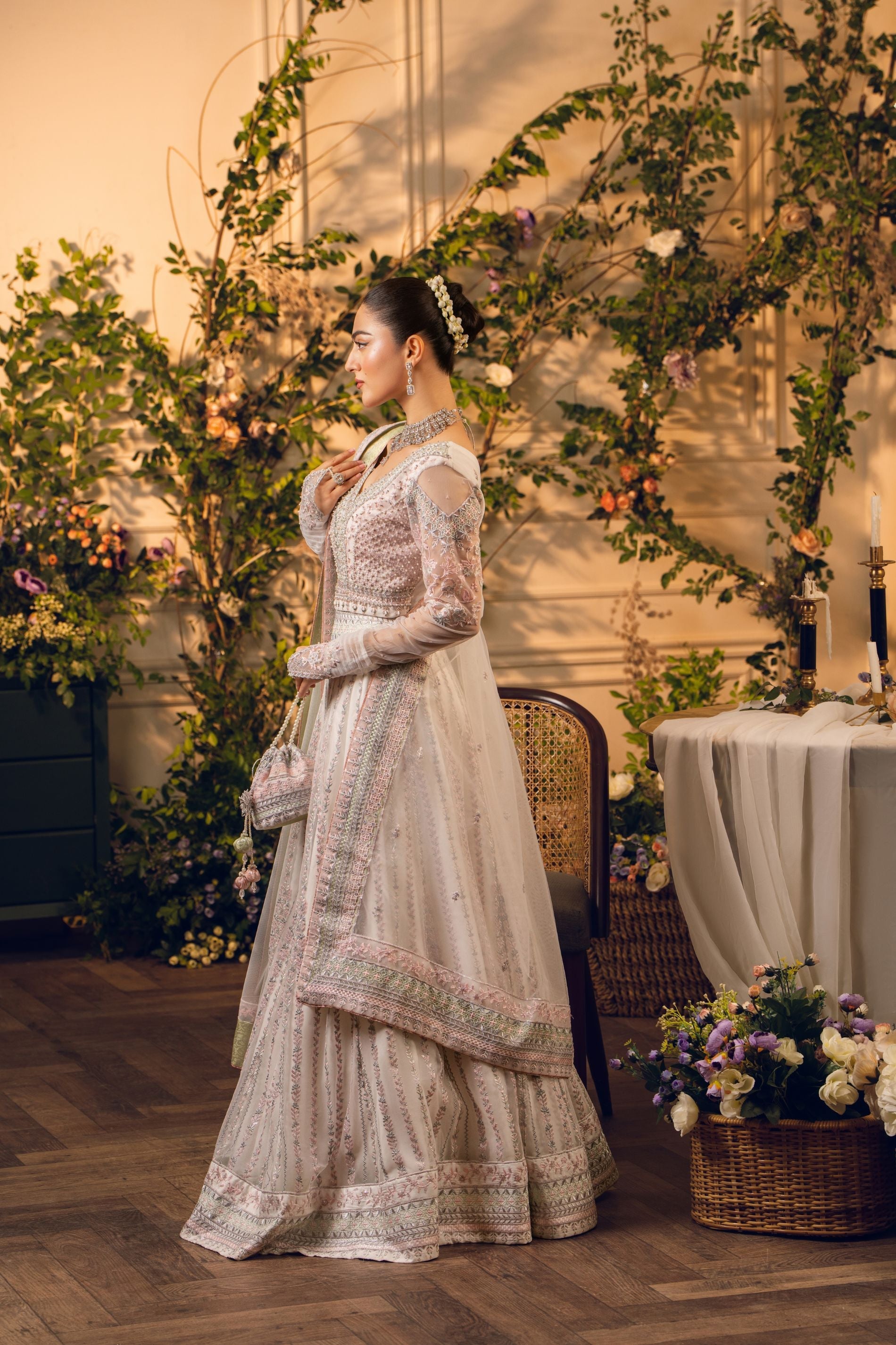 Off white flowy dress with matching flowy lehnga, adorned with subtle shimmer