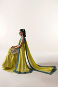Adorned in the resplendent hues of lime yellow, 'Finch' epitomizes sartorial elegance. The sleeveless cut of the embroidered short tissue silk shirt harmonizes with the opulence of flared panelled trousers, meticulously crafted from Thai silk, featuring a mesmerizing metallic silver block printing design. Completing this ethereal ensemble is a silk dupatta, adorned with teal-colored block-printed borders, invoking an aura of regal sophistication.