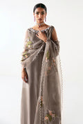 Draped in Gray Glamour: Introducing 'Swish', where elegance meets edge. Enchant in our embroidered tissue silk bodice cut shirt with a side-long slit, complemented by a fully adorned organza dupatta and refined Thai silk bootcut pants. A flawless choice promising grace and sophistication.