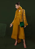 Standout in our lime yellow wrap embellished in clusters. Satin finishing and belt is added to accentuate the waistline. This outfit comes with culotte pants in silk featuring organza details.