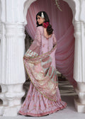 This graceful lilac chiffon ensemble is a perfect blend of elegance and contemporary charm.The short chiffon lilac shirt is delicately embroidered adding a touch of intricate craftsmanship to its lightweight silhouette with embroidered sleeves and sleeve borders Paired with a flowing chiffon embroidered dupatta featuring an embroidered organza pallu the look is elevated with subtle texture and refined detailing The outfitis completed with a matching embroidered chiffon gharara ,offereing effortless movement and a soft,feminine finish.Ideal for festive occasions and formal gatherings,this esemble embodies soiphistication with a modern flair.