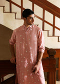 A pure raw silk kurta in coral blush, embroidered with tonal floral motifs using multihead technique and delicately hand-embellished with cut daana and sequins throughout. Paired with straight trousers in matching pure raw silk bringing harmony to an intricately detailed silhouette.