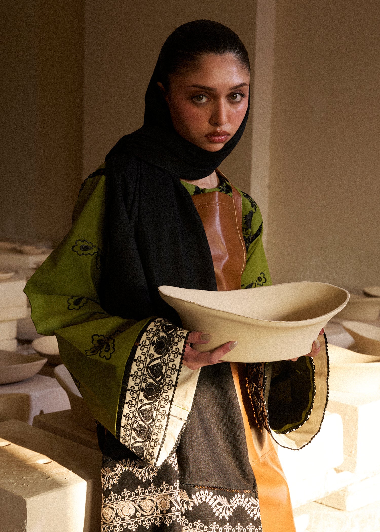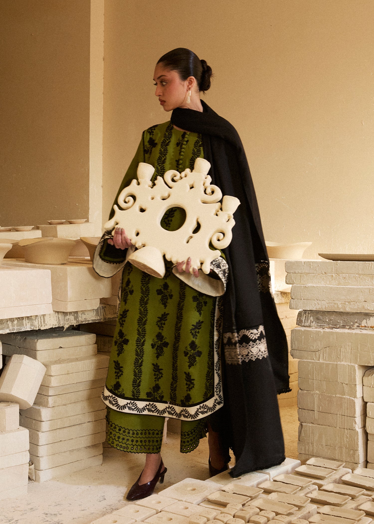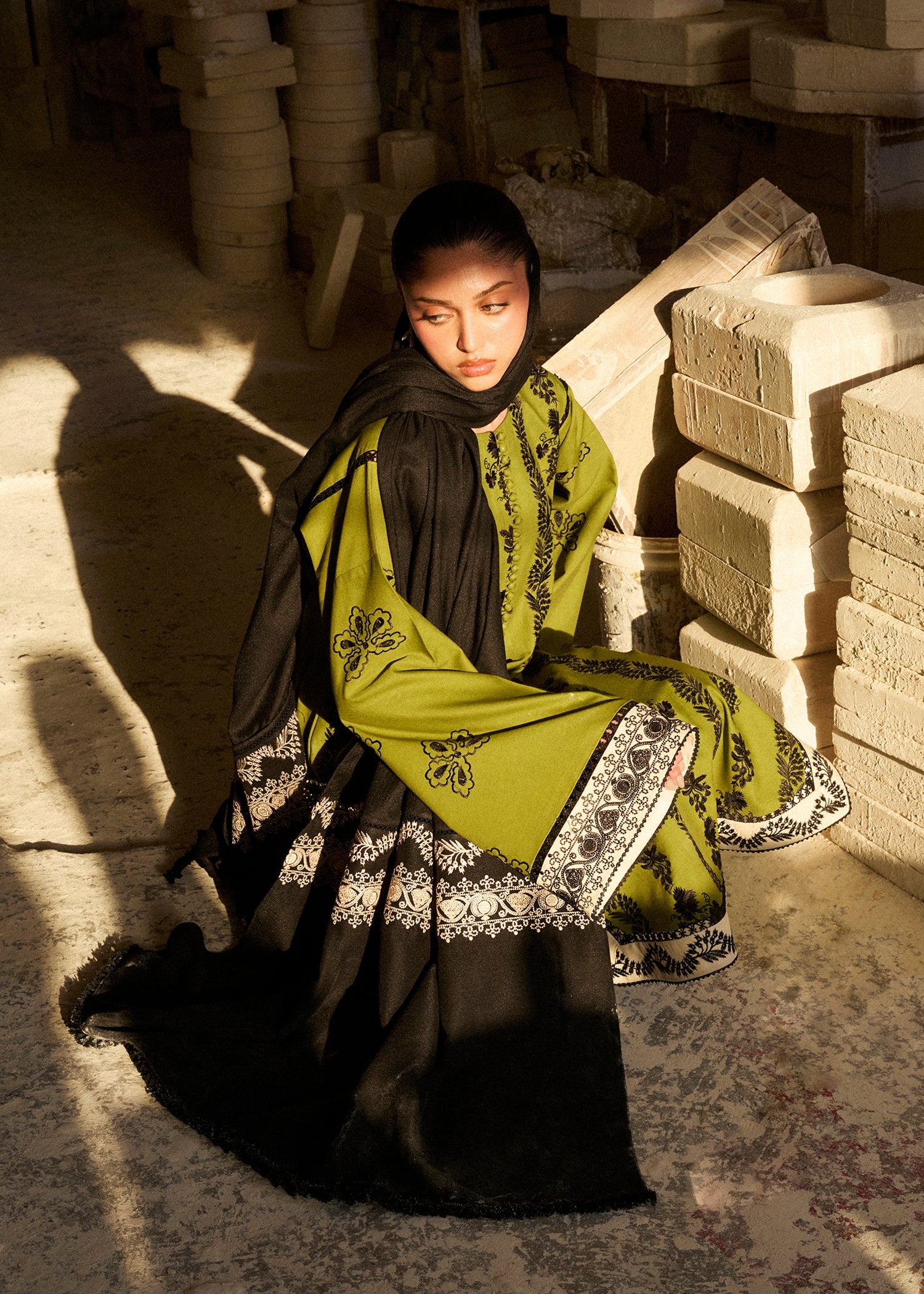Elevate your winter wardrobe with this breathable olive green khaddar three-piece ensemble. Adorned with intricate multihead black embroidery, and ivory embroided patches on the shirt, it features sleeves with ivory embroided patch, a slit neck with loops and buttons, and with stylish embroided culottes. Paired with an embroidered shawl, this look blends tradition and trend—perfect for effortless winter sophistication.