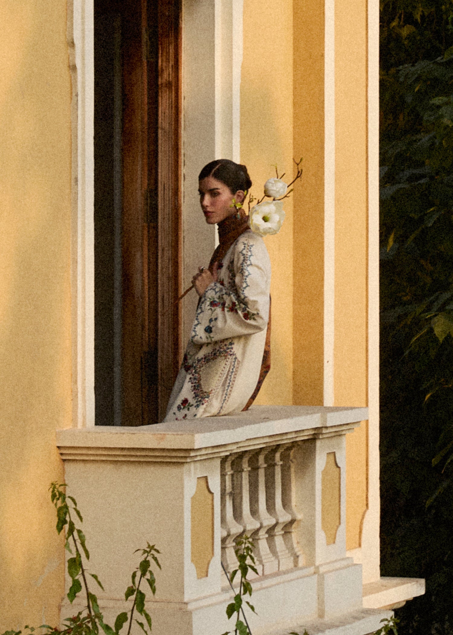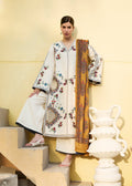 An elegant 3-piece outfit featuring an ivory khaddar shirt. The shirt boasts intricate cutwork embroidery details on the front and stylish bell sleeves with embroidery. It is paired with chic culottes that feature delicate lace details, and completed with a striking, contrast-printed shawl.