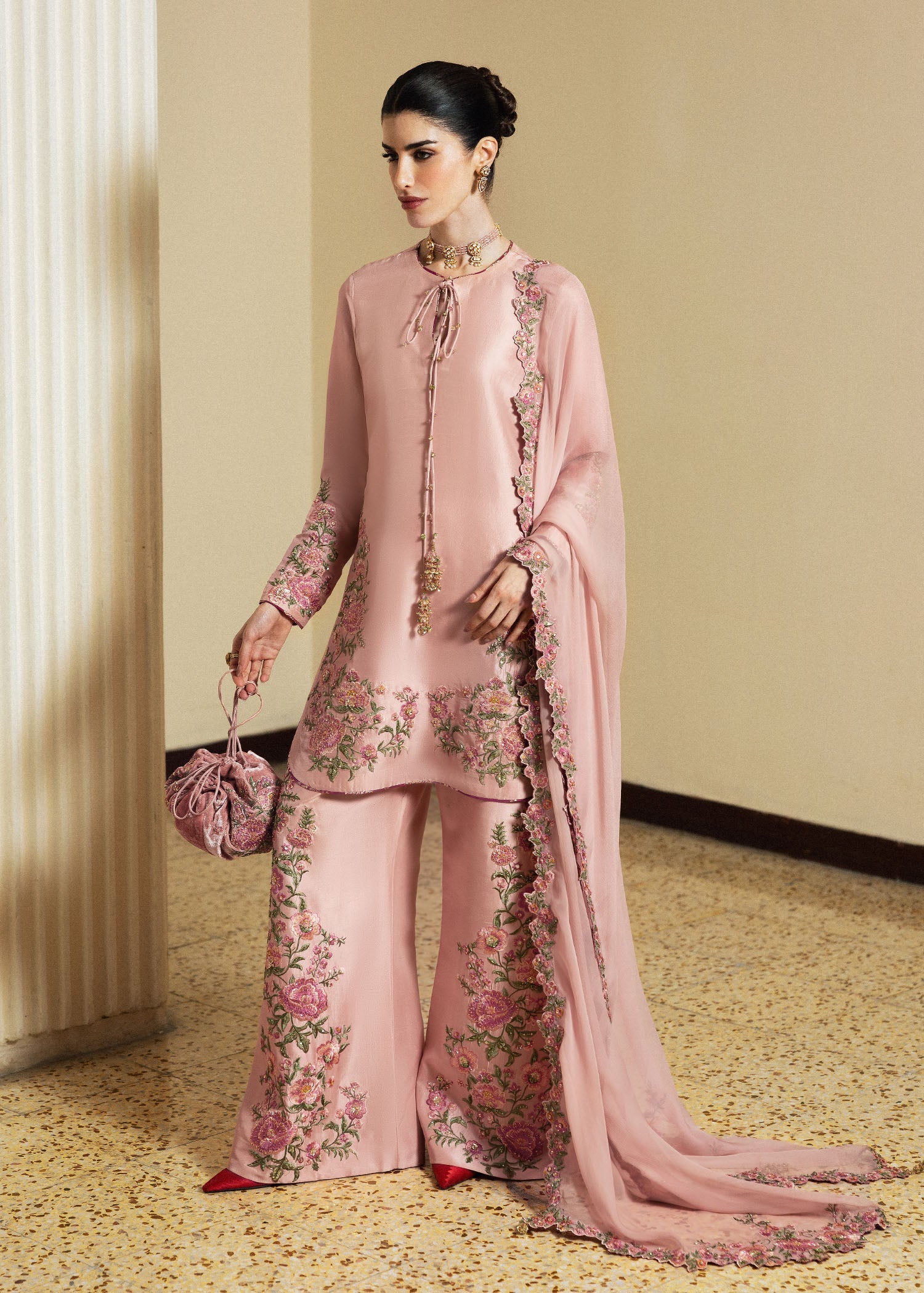 The designs feature a mix of traditional flat embroidery and textured 3D floral bunches that appear raised from the fabric surface. It’s a 3-piece set featuring intricate embroidery work, including floral motifs and possibly 3D floral placement on the raw silk pants and chiffon dupatta borders. The neckline of this raw silk kurta also has detailed work and a tie-up design. This dress showcases a diverse range of embroidered floral details and garment layouts, ranging from high-fashion runway pieces to detailed technical bail.