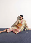 A light parrot green silk coord set featuring an all-over paisley print, complemented by a parrot green silk collar band and delicate pink satin silk tassels and trims. The balloon sleeves are finished with floral print cuffs and subtle pink satin piping for added texture. Paired with matching printed culottes featuring a bold double border — a playful yet polished silhouette rooted in soft contrasts and thoughtful detailing.