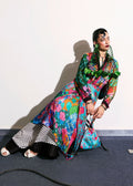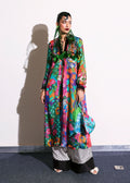 A mid-calf, A-line silhouette brought to life with vibrant multicolored printed silk panels. Accented with black satin silk trims along the neckline, sleeve cuffs, and trouser hem, and finished with soft pink satin piping for a subtle contrast. Paired with black and white polka dot trousers for a playful yet refined finish.